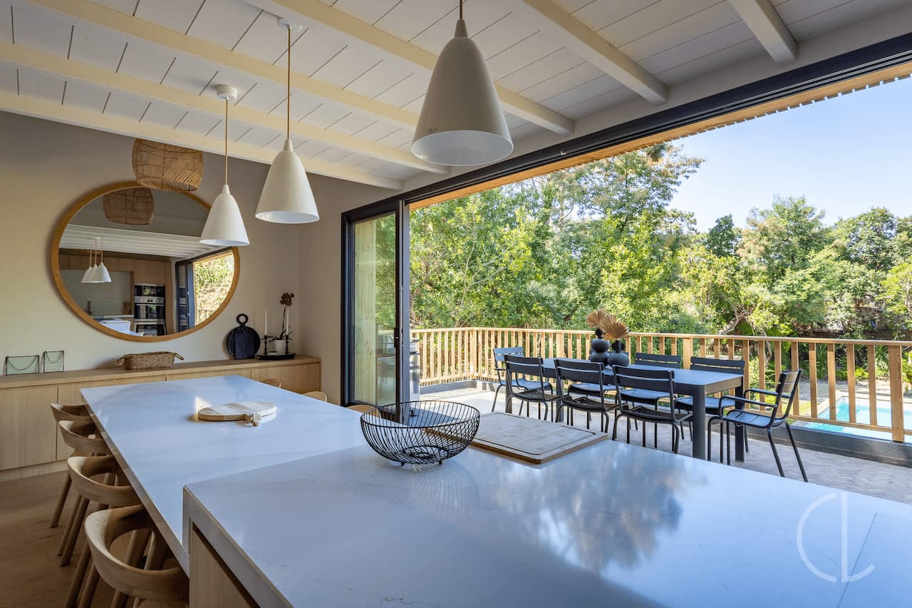 - Le niveau principal accueille un espace de vie convivial avec son salon et sa cuisine américaine équipée, ouverts sur l’extérieur grâce à ses grandes baies vitrées. La terrasse suspendue avec vue sur la piscine vous permettra de profiter pleinement de vos repas en famille.