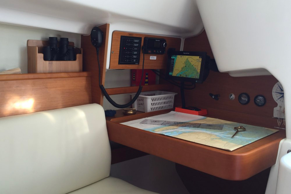 Le coin table à cartes héberge l’électricité et l’électronique du bord, les jauges carburant et batterie, une prise 12V bien pratique. Je laisse, au delà des cartes et ouvrages règlementaires, la règle CRAS, le compas pointes sèches, un compas de relèvement, une paire de jumelles et un anémomètre portable à disposition.